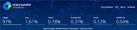 I Danmark er Google langt den mest dominerende søgemaskine med omkring 97% af markedet. Internationalt har Microsofts Bing, Yandex og Baidu også en vis del af markedet.